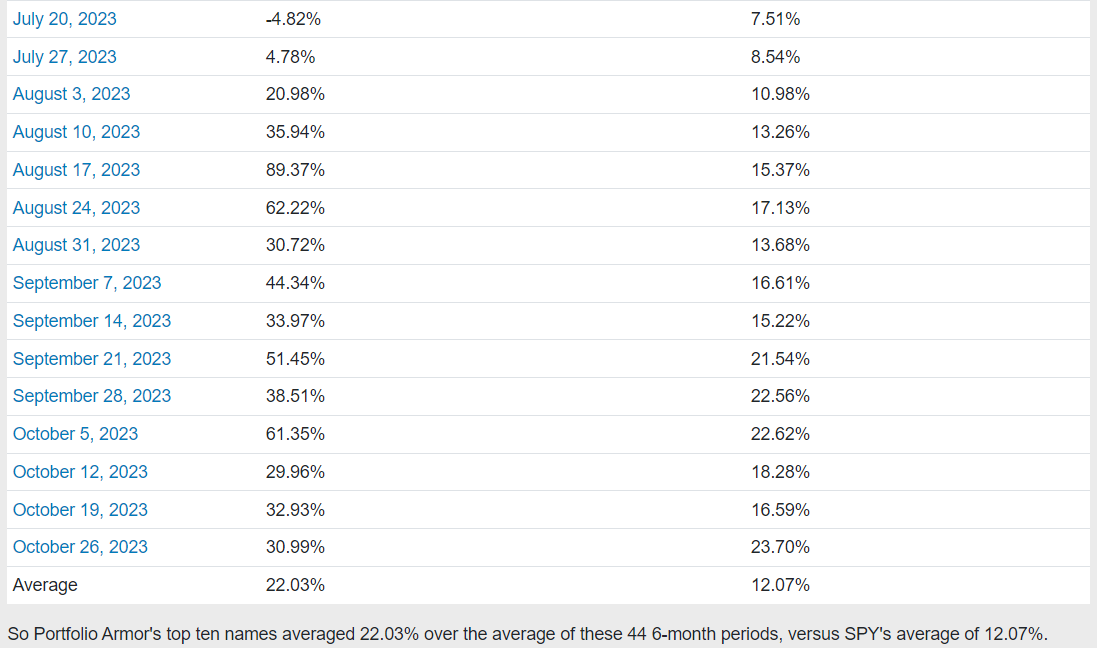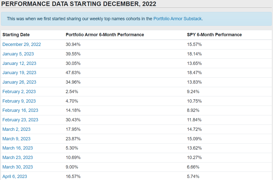 Each week, since we started this Substack at the end of 2022, we’ve posted Portfolio Armor’s current top ten names. Those are the securities our system estimates will generate the highest returns over the next six months.