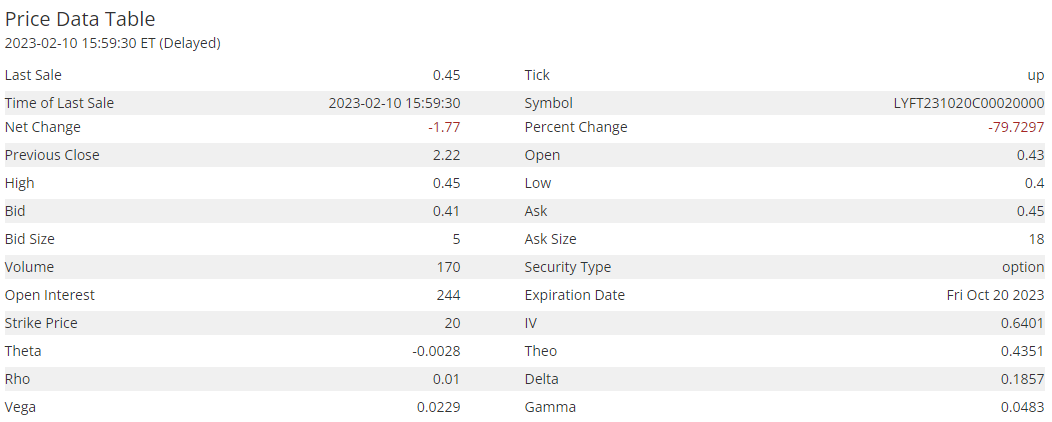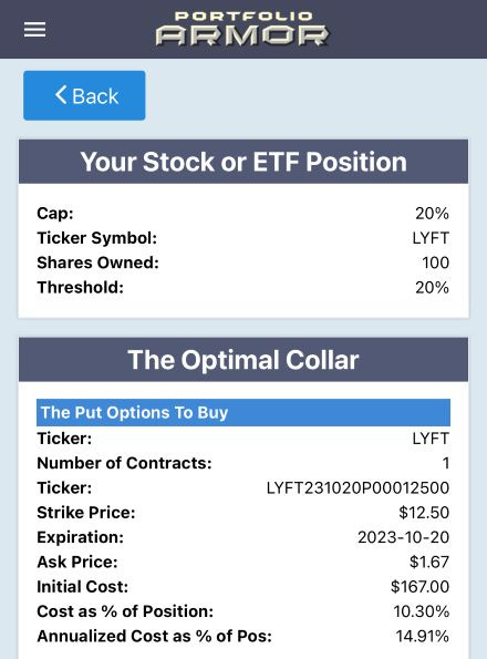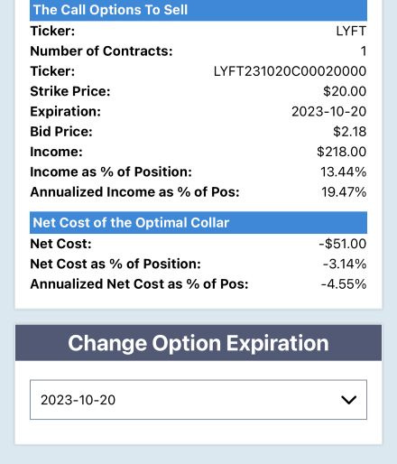 As of Thursday’s close, this was the optimal collar to hedge 100 shares of LYFT against a greater-than-20% drop by October without capping your possible upside at less than 20% over the same time frame.