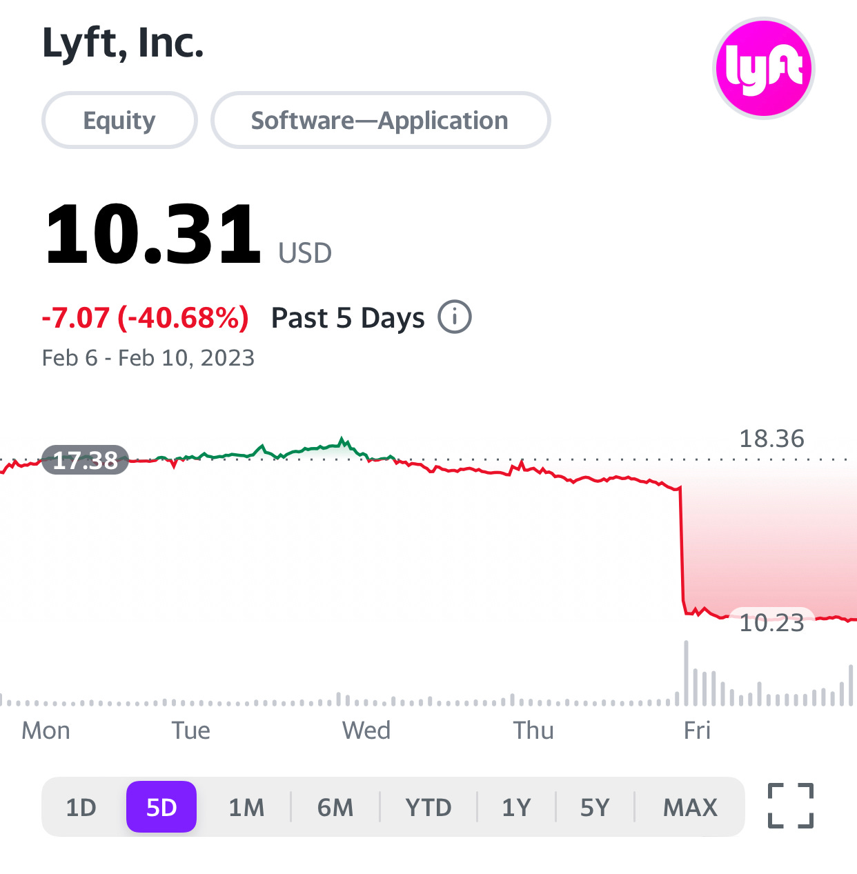 The next day, LYFT shares crashed 36%. The 5-day chart shows how the stock gapped down from Thursday’s close to Friday’s open.