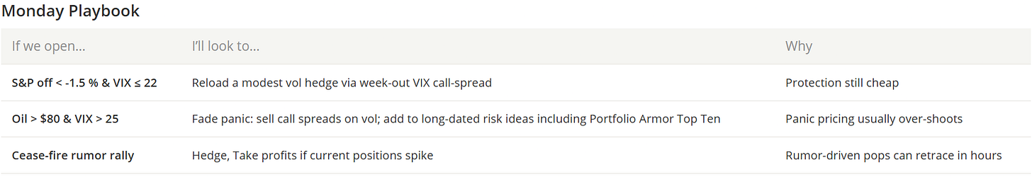 On Thursday I opened a VIX call-spread hedge. I peeled it off in two tranches on Friday for gains of +159 % and +53 %, respectively, before Iran's first ballistic missile strikes landed in Israel. In hindsight I probably should have kept that second slice open, but hindsight is cheap tuition.