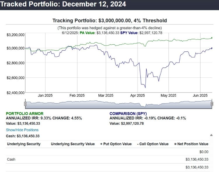 I don't talk about this a lot because it bores me, to be honest, but for a lot of investors, boring is good. With the Portfolio Armor website's hedged portfolios, you just tell the system how much you want to invest, and the largest decline you are willing to risk over the next six months, and it does the rest.
