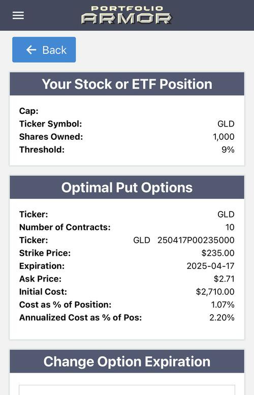 Another thing you can do to lower your risk, is to buy optimal put options on a gold-tracking ETF such as SPDR Gold Shares (GLD 0.00%↑). For example, as of Tuesday's close, these were the optimal puts to hedge against a greater-than-9% decline in GLD over the next 6 months.