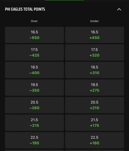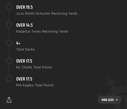 The screen captures above from the DraftKings, Inc. (DKNG) betting app don’t show the odds of each of the ten legs, but you see them when you select them. For example, the last leg above, “Over 17.5 PHI Eagles Total Points” had odds of -425. Remember, the more negative the number, the bigger the favorite, so this is considered to be a likely outcome.