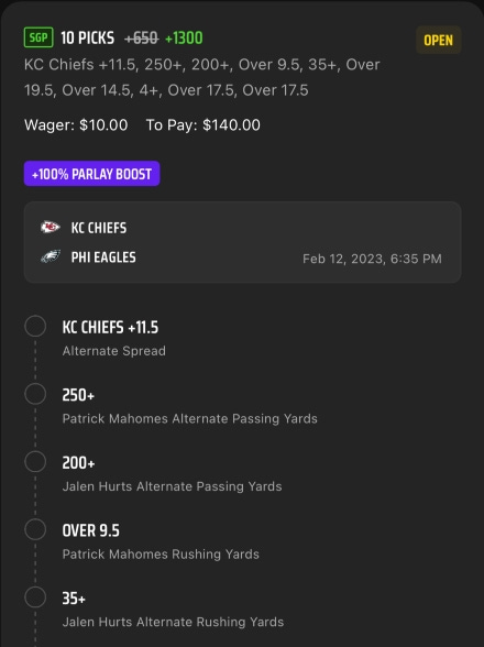 One other term to get out of the way is same game parlays. A parlay is simply a bet on multiple events all happening, so a traditional parlay is a bet on multiple teams winning their respective games. A same game parlay is a bet on multiple events happening during the same game. Here is my same game parlay on today’s Super Bowl. It shows the odds for the whole parlay at the top: +650 +1300 (the initial +650 odds were boosted by 100%; more on that below).