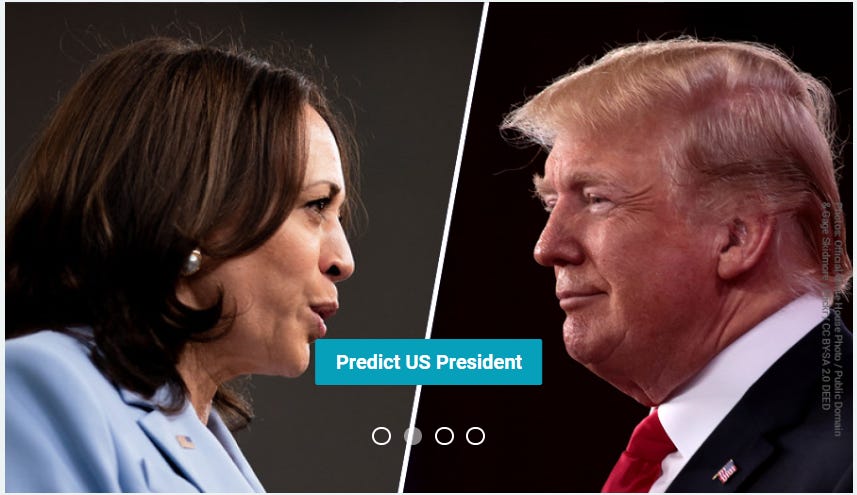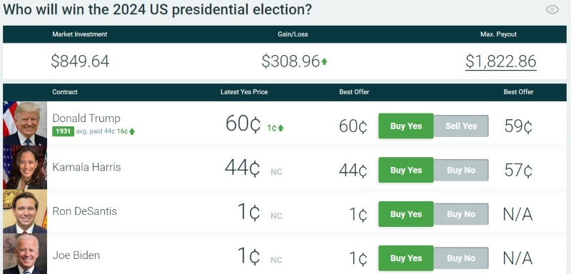 I’ve used PredictIt in the past to bet on election outcomes, and I currently have a bet on Trump to win the election there at 44 cents (winning PredictIt shares cash out at $1).