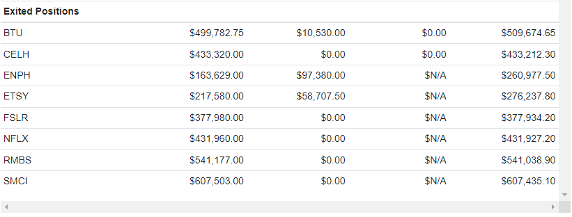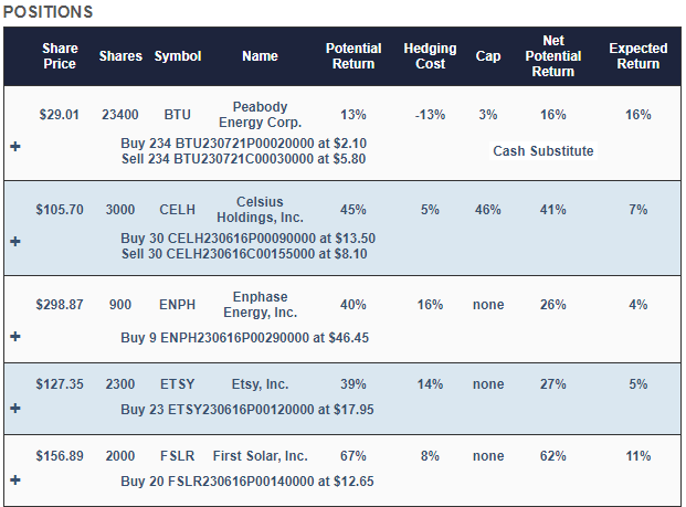 Seven of these names were the ones with the highest potential return estimates, net of hedging cost, in December. Our site started with equal dollar amounts of each, and then rounded them down to round lots to lower hedging cost. Then it used a tightly collared position in BTU to absorb most of the leftover cash from that process.