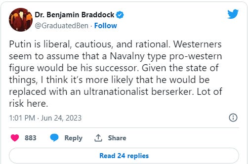 If you want to be able to click on the actual tweets in this post, you can do so in the ZeroHedge version of it here: https://www.zerohedge.com/news/2023-06-24/dodging-bullet-russia