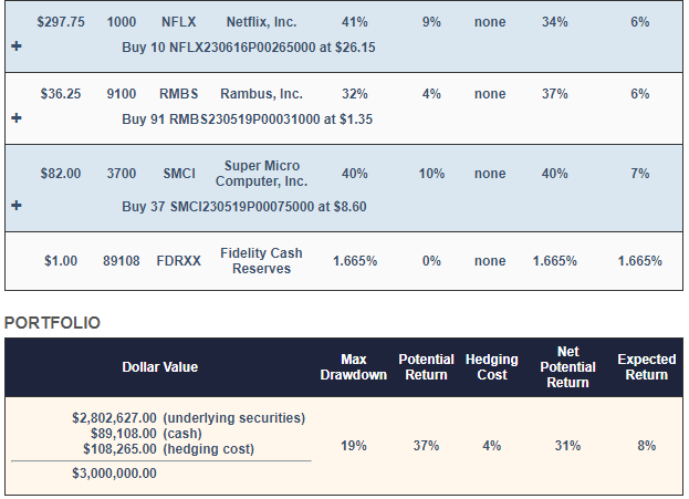 The basic idea of our hedged portfolio method is you decide how much risk you're willing to take, and how much money you want to invest, and the Portfolio Armor website presents you with a hedged portfolio designed to do just that. Here's a real world example.