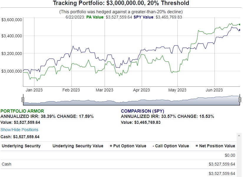 On December 23rd of last year, this was the portfolio our site presented to an investor with $3 million who wanted to make sure his portfolio didn't drop by more than 20% over the next six months, in a worst-case scenario (you can use this process for portfolios as small as $30k too):