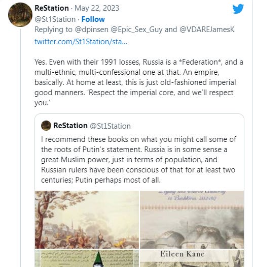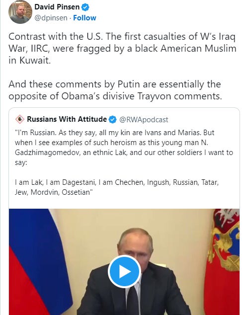 Since racism (and antisemitism) are the worst sins in the West, Western critics sometimes dishonestly claim Putin is a racist, but in fact he has presided over a multiethnic, multiconfessional empire in a way that's largely been inclusive rather than divisive. In some ways, Russia has handled its diversity better than the U.S. has.