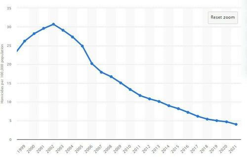 As of 2021, the homicide rate in Russia was down 85% since Putin came to power