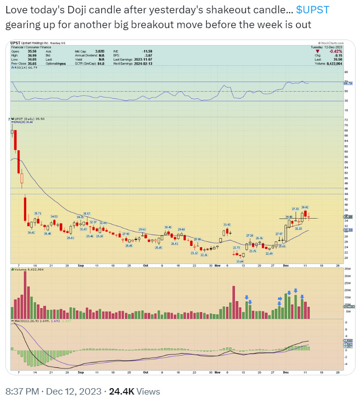 Upstart Holdings (UPST 0.00%↑) was trading at $35.50 then, and I was about to place an order to buy the at-the-market calls on it expiring on 12/15 at $1.15, or something like that. I was going to add it as a bonus trade in my 12/13 trade alert. I put it off until the next day, then got distracted with the MBI business, and by then the UPST had already moved. UPST ended the week at $44.52, meaning we could have made nearly 800% on those $35.50 calls. Sorry about missing that. I’ll pay more attention to my Market Watchers list going forward.