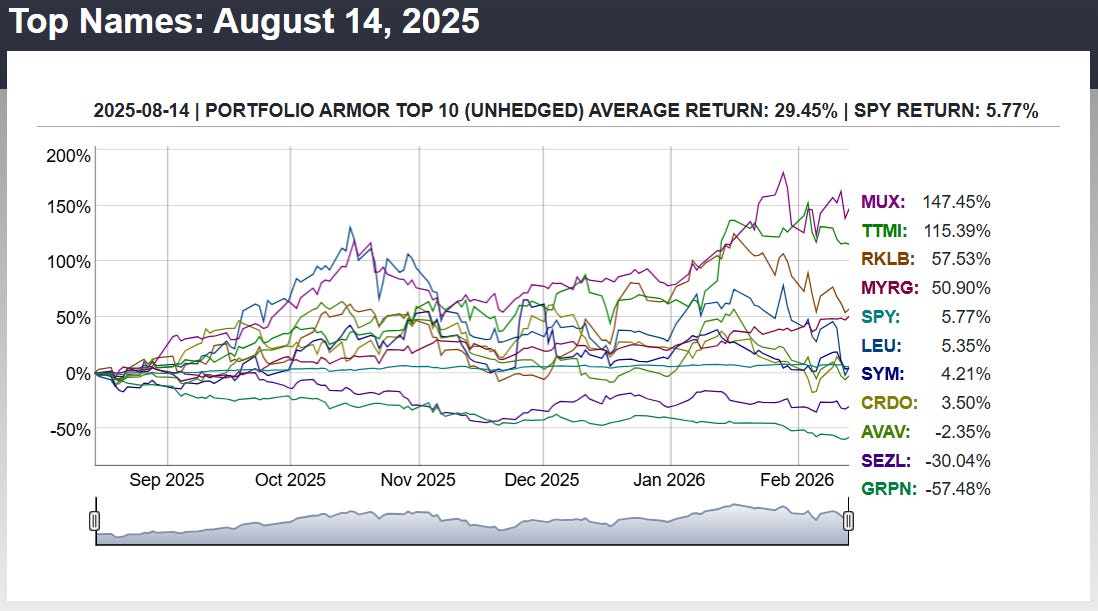 No exits this week, as I haven’t been doing our basic strategy, which involves buying stocks and ETFs, and have been focusing on options instead. Nevertheless, the performance of our system’s top names have nearly doubled that of the SPDR S&P 500 Trust (SPY 1.32%↑) since I started this Substack. Here’s the performance of our last weekly Top Names cohort to finish its 6-month run: