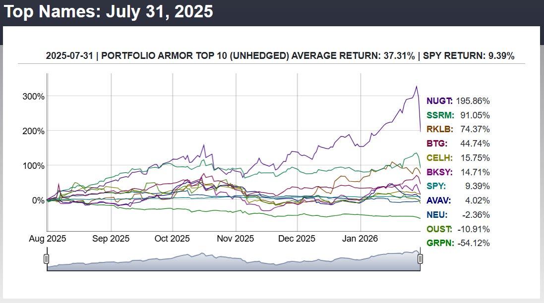 No exits this week, as I haven’t been doing our basic strategy, which involves buying stocks and ETFs, and have been focusing on options instead. Nevertheless, the performance of our system’s top names have nearly doubled that of the SPDR S&P 500 Trust (SPY 1.32%↑) since I started this Substack. Here’s the performance of our last weekly Top Names cohort to finish its 6-month run: