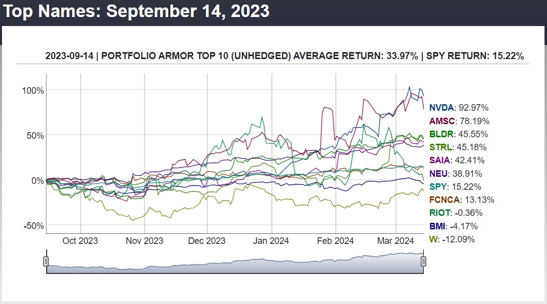 Our core strategy of buying equal dollar amounts of the Portfolio Armor web app’s top ten names, putting trailing stops of 10%-15% on them, and replacing them with names from the current week’s top ten when we get stopped out of a position continues to perform well. In our Top Names post on Thursday, we shared the 6-month performance of our top ten names from September 7th; here is the 6-month performance of our top ten names from September 14th: