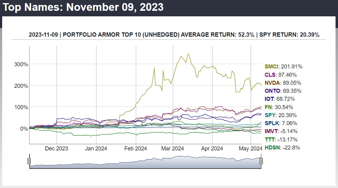 No exits this week, but our core strategy continues to do well, driven by the outperformance of our top names. Our most recent weekly top names cohort for which we have 6-month returns is the one from November 9th of last year. It finished up 52.3%, versus SPY 0.00%↑ which was up 20.39% over the same time frame.