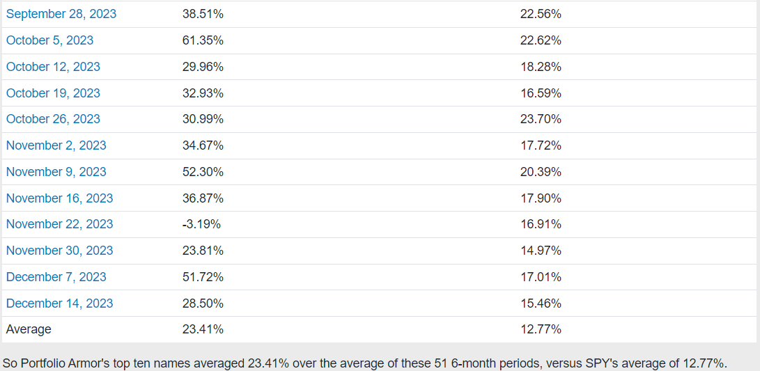And as you can see above, our top names have averaged returns of 23.41% over the next six months, versus SPY’s average of 12.77%. You can see an interactive version of the table above here, where you can click on each date and see a chart showing each of the holdings that week.