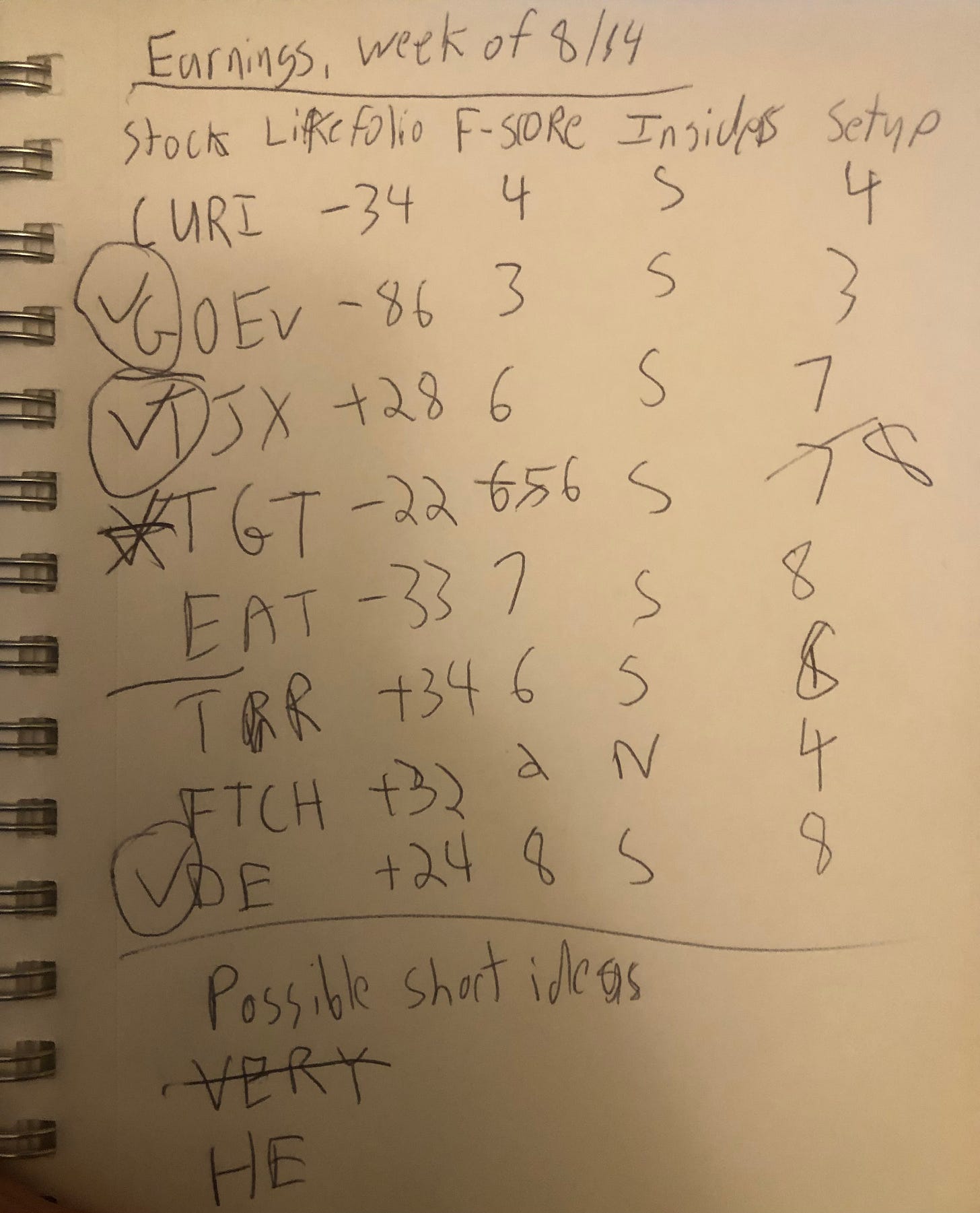 This week we entered earnings trades on the three names with checkmarks next to them in the image below.
