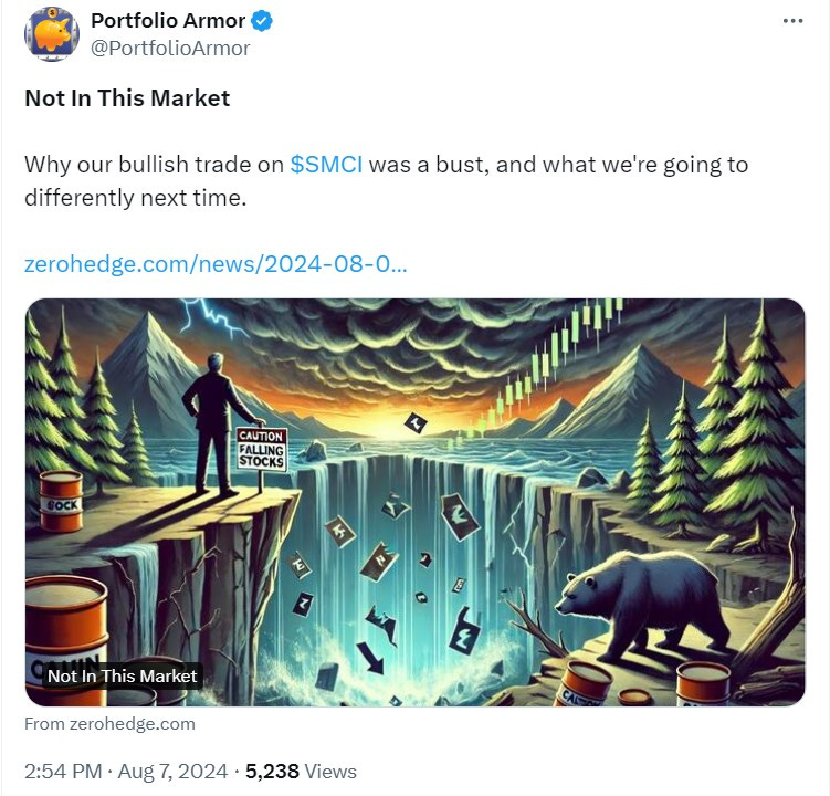 Our core strategy is to buy equal dollar amounts of Portfolio Armor’s Top Ten Names, put trailing stops of 10% to 20% on them, and then replace the stocks with current top names when we get stopped out. The recent market environment has made that challenging, as this HOOD exit illustrates. I bought the stock as a top name last Friday, with a 20% trailing stop, and got stopped out of it on Monday after Japan crashed.