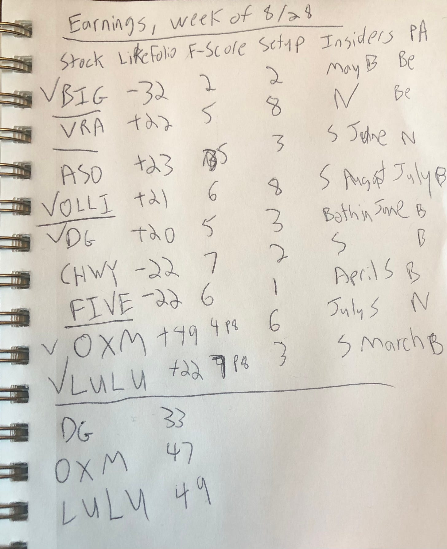 On the options side, here’s a look at my earnings trades notes for this week; the names with checkmarks next to them are ones I placed trades on.