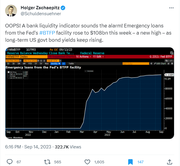 Western Alliance (WAL -0.75%↓) was one of the regional banks we bet against due to its level of unrealized losses and indications that it had exhausted the new federal bank assistance facility, the BTFP. We keep getting more signs of stress in the banking system, but so far, no more regional banks going bust. It could be we were too early with some of these trades.