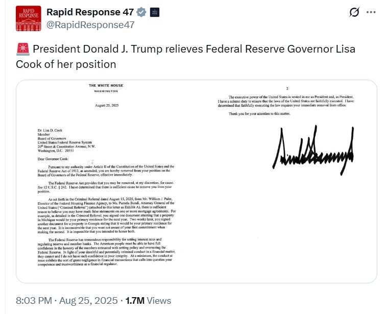 Last night, President Trump fired Federal Reserve Governor Dr. Lisa D. Cook, after the Bill Pulte, the director of the Federal Housing Finance Agency, asked the Department of Justice to investigate her for suspected mortgage fraud.