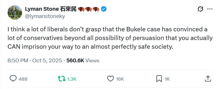 El Salvador’s example proves that tolerating crime at our level (we have a homicide rate 6x that of El Salvador) is a policy choice, and an increasingly unpopular one, at that.