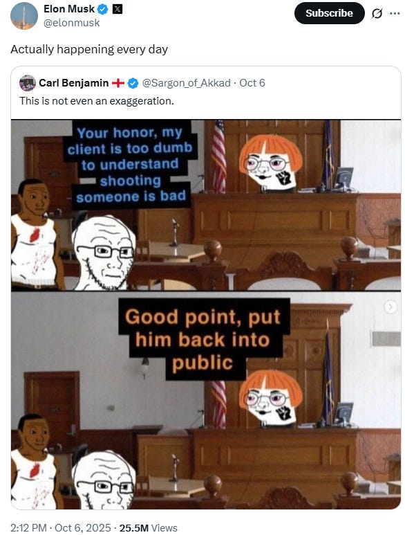 Despite being the richest man in the world and America’s greatest industrialist, Elon Musk has been fairly mainstream politically for most of his life, so he is something of a bellwether. As you can see by the X post he quoted below, he has drifted right on law and order.