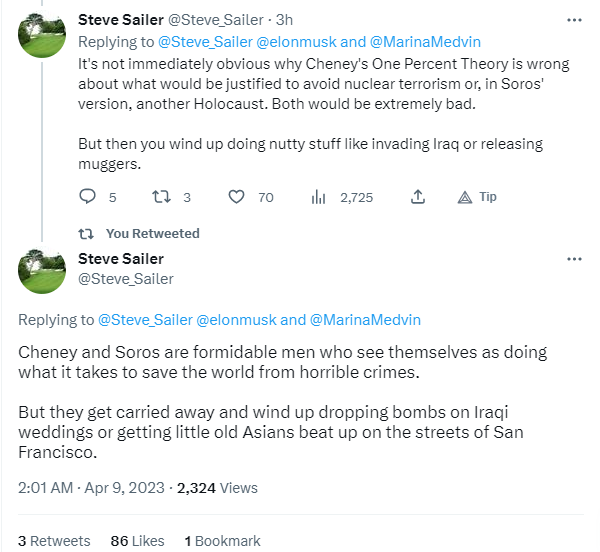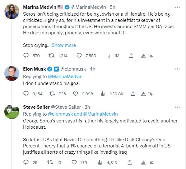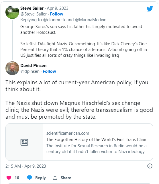 As unlikely as it may seem, there’s actually a link between Weimar and that case in Texas. The Weimar Republic preceded Nazi Germany, which perpetrated the Holocaust, which had a lasting impact on George Soros, who financed the election of the district attorney who prosecuted the man for shooting a BLM rioter who pointed an AK-47 at him. The journalist Steve Sailer connected those dots for Elon Musk, when he wondered why Soros had helped elect prosecutors across the country who are soft on criminals, but tough on those who fight back against them.