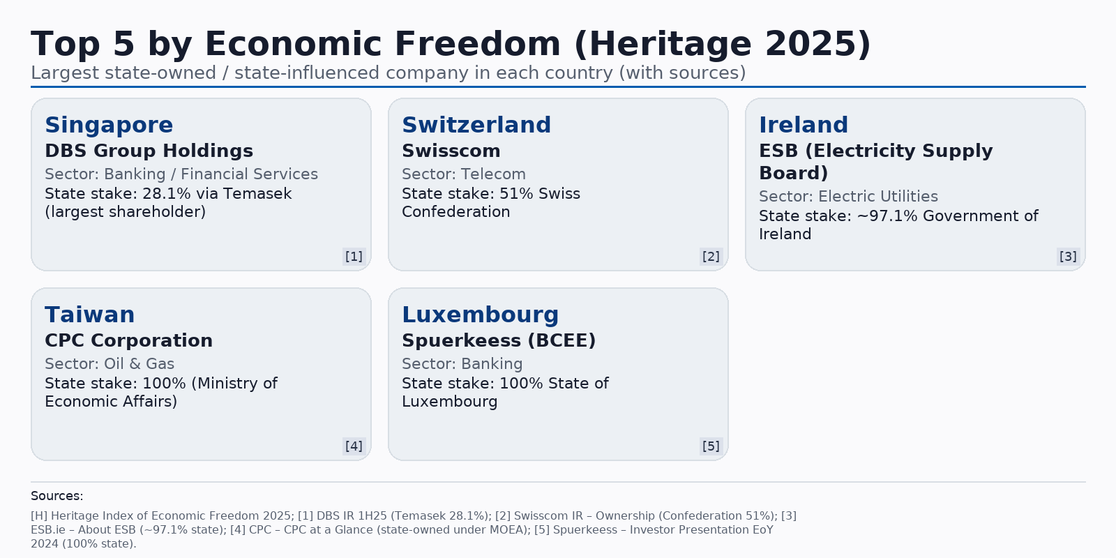 And the “freest” economies? They use the state, too. Heritage’s 2025 top five on economic freedom are Singapore, Switzerland, Ireland, Taiwan, and Luxembourg. All five have large, state-owned or state-influenced champions: