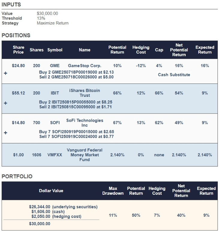 Result: GME served as a capital-efficient “cash substitute,” boosting expected return while still respecting the portfolio’s drawdown limit.(Note: the portfolio also carried a small VMFXX line for residual cash, but the “Cash Substitute” label refers to the hedged GME position.)