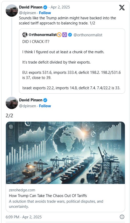 A few different posters on X determined that the Trump Administration used our trade deficit with each country to determine the size of our reciprocal tariffs. This is essentially the "scaled tariff" approach we wrote about here a couple of weeks ago.
