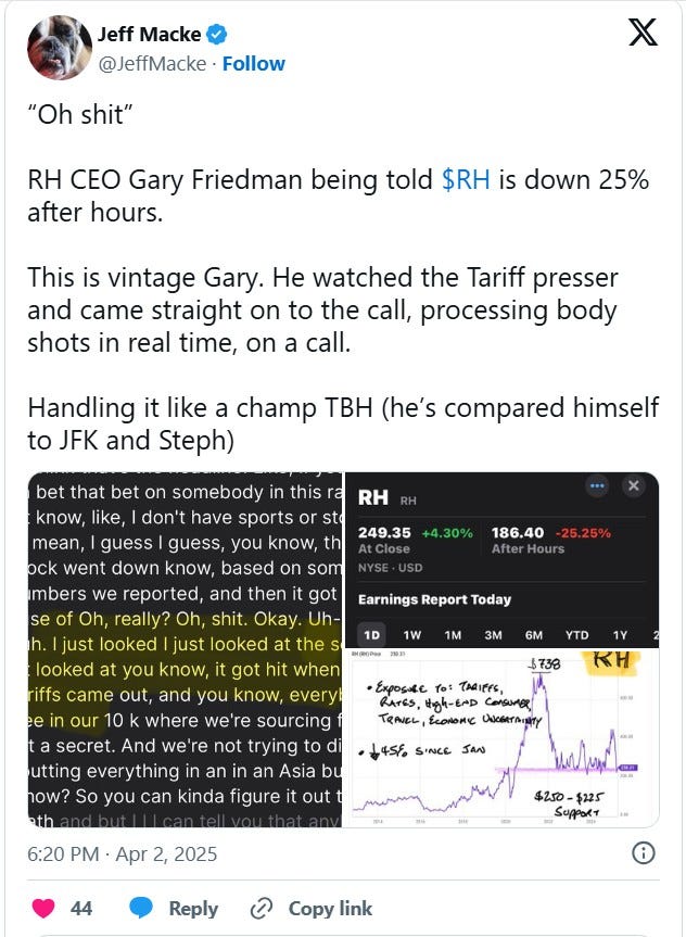 The main market implication now is that the markets are going down. The futures are a sea of red, and American companies heavily dependent on imports are going to face some major headwinds. The CEO of the retailer formerly known as Restoration Hardware, RH (RH 0.00%↑) saw his company's stock drop 25% after hours, during his earnings call.