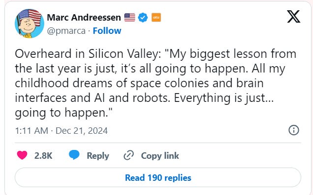With Trump heading back to the White House and Elon Musk unshackled, a positive future seems possible again, as Silicon Valley legend Marc Andreessen shared on X.