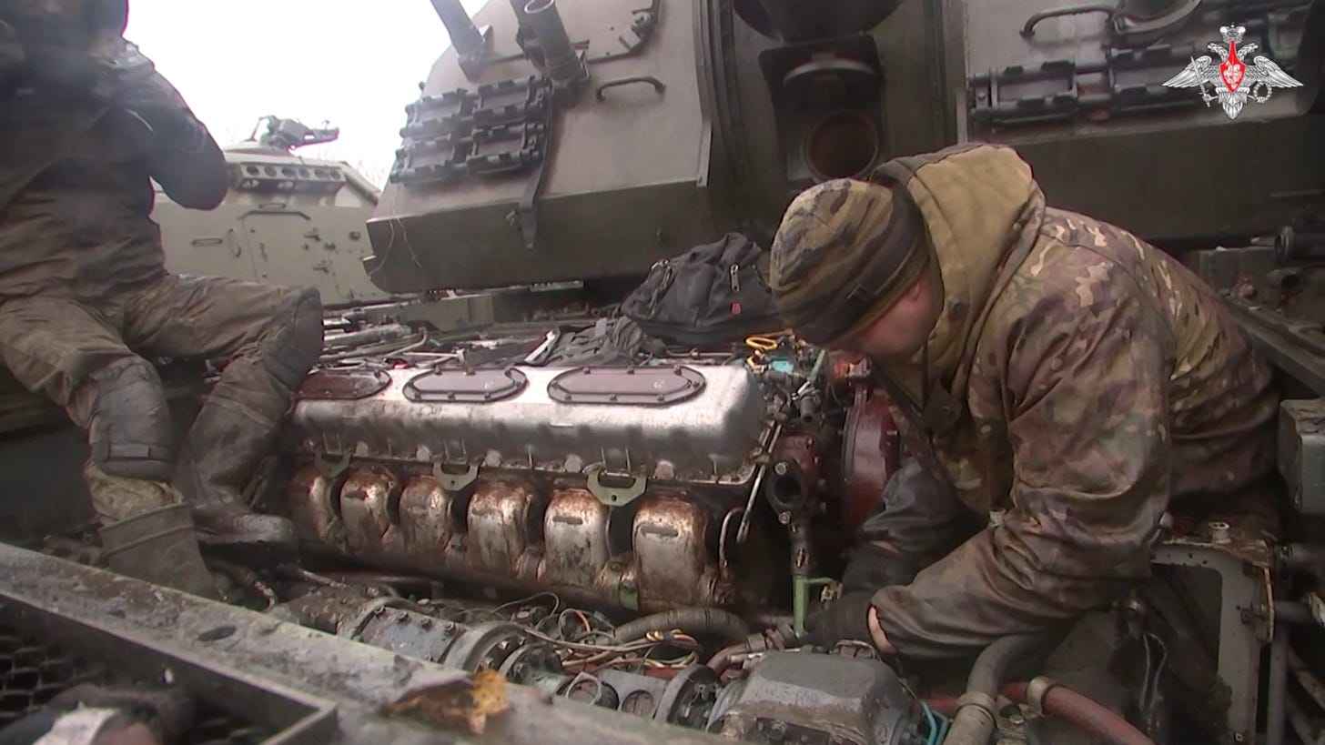 Russian troops repair an armored vehicle (screen capture via Russia’s Ministry of Defense).