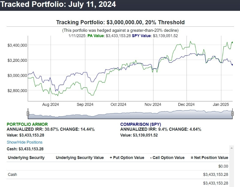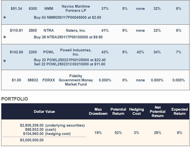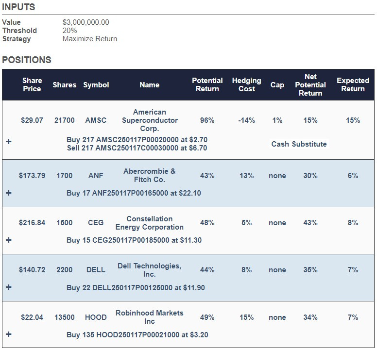 Here's a portfolio our system created for an investor in July of last year. This was for an investor unwilling to risk a decline of more than 20% over the next 6 months. This one included American Superconductor (AMSC 0.00%↑), Abercrombie & Fitch Co. (ANF 0.00%↑), Constellation Energy Corporation ( CEG 0.00%↑), Dell Technologies, Inc. ( DELL 0.00%↑ ), Navios Maritime Partners LP ( NMM 0.00%↑ ), Natera, Inc. (NTRA 0.00%↑ ), and Powell Industries, Inc. ( POWL 0.00%↑ ).