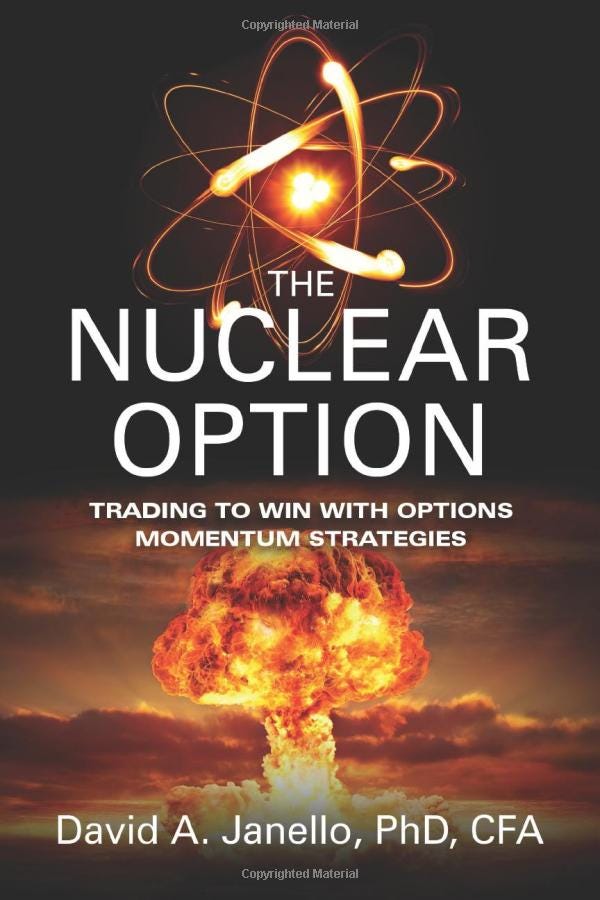 Nassim Taleb once expressed respect for my deadlift personal record, but our interactions ended when he blocked me on Twitter years ago, for some perceived offense I don’t remember. In contrast, David Janello has been unfailingly helpful when I’ve had questions about structuring options trades. He’s been trading options since the Carter administration, and he’s able to explain the pros and cons of various approaches without unnecessary jargon. The Nuclear Option is his counsel in book form. It’s worth reading if you want to trade options.