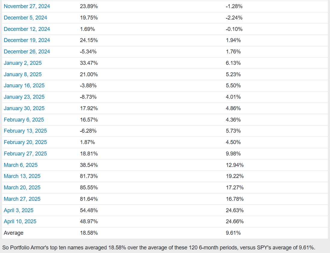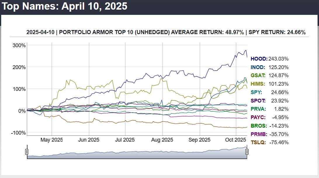 Before we get to this week’s top ten names, let’s look at the final, 6-month performance of our top ten names from 4/10/2025.