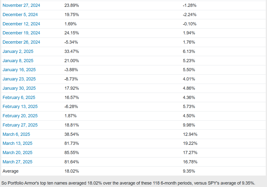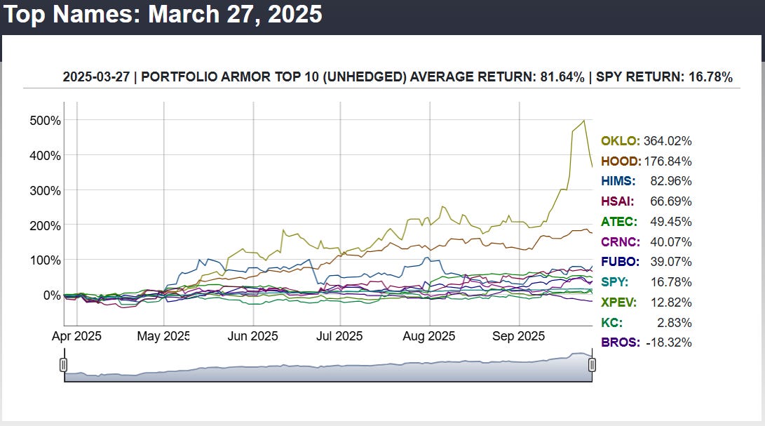 Before we get to this week’s top ten names, let’s look at the final, 6-month performance of our top ten names from 3/27/2025.