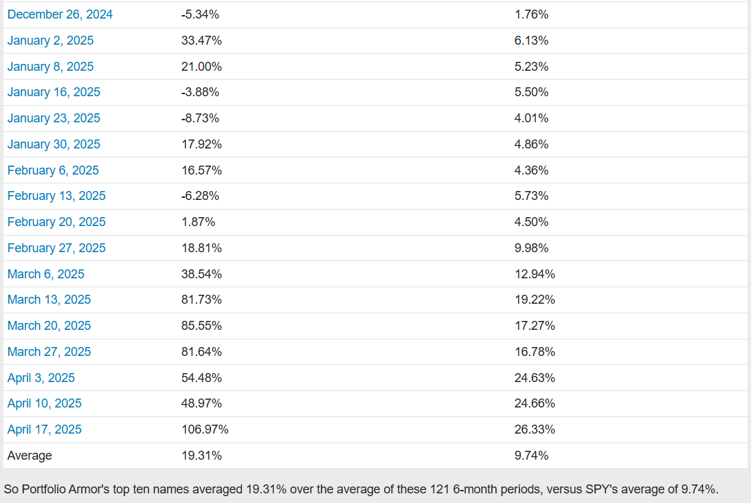 Before we get to this week’s top ten names, let’s look at the final, 6-month performance of our top ten names from 4/17/2025.