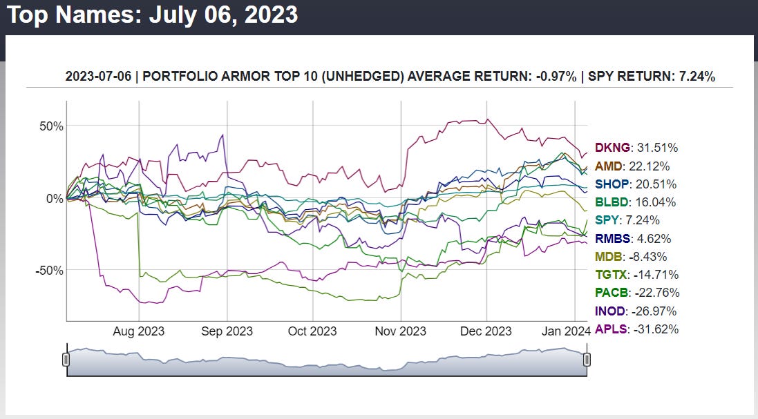That was the 7th top names cohort of 28 since we started this Substack that underperformed the market (PA top ten returns are on the left below; SPY returns on the right).