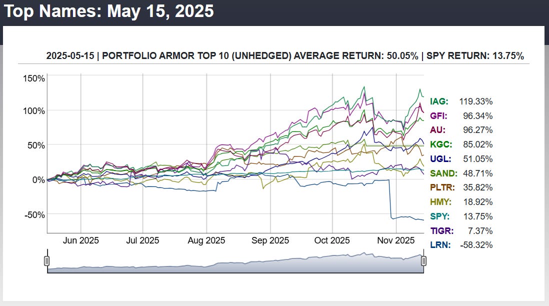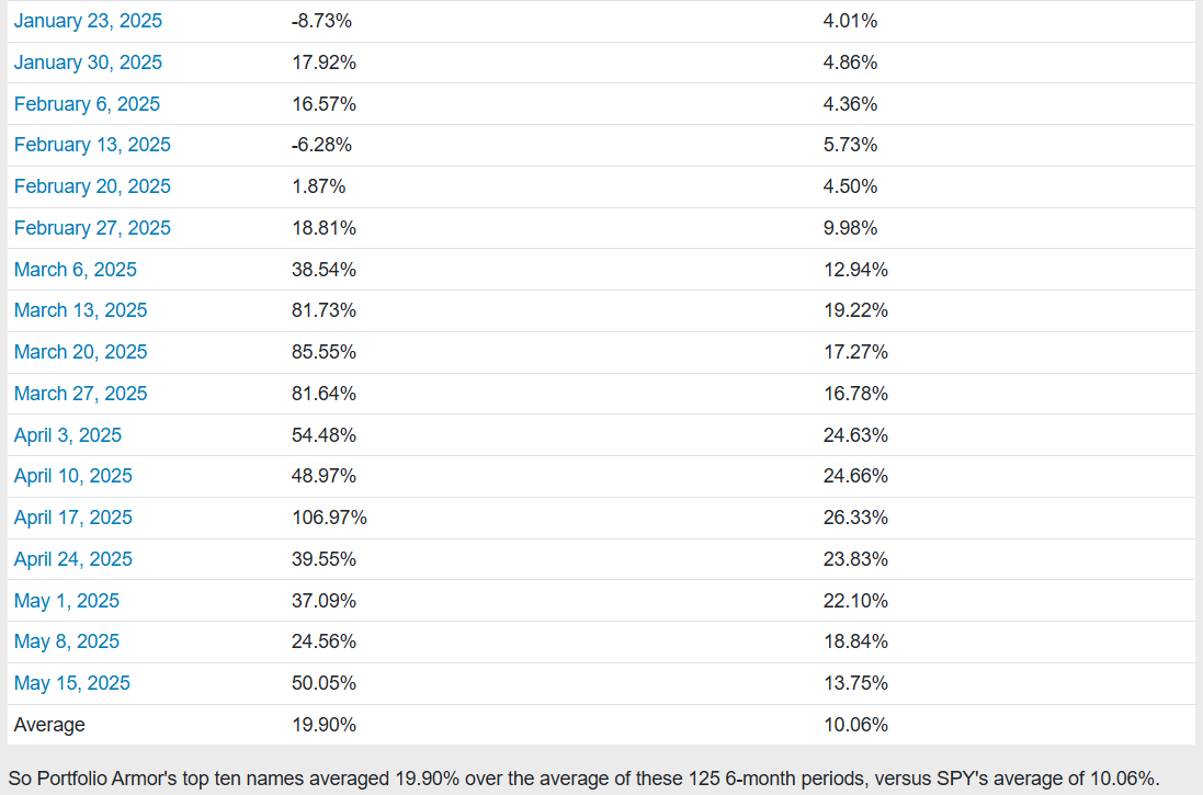 Before we get to this week’s top ten names, let’s look at the final, 6-month performance of our top ten names from 5/15/2025.