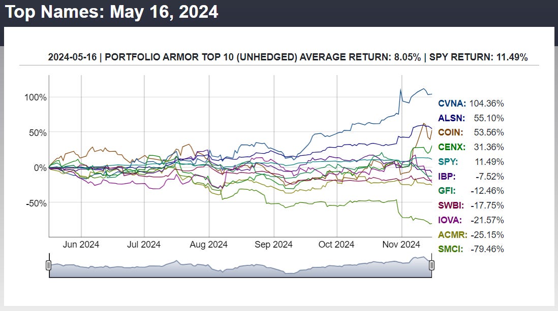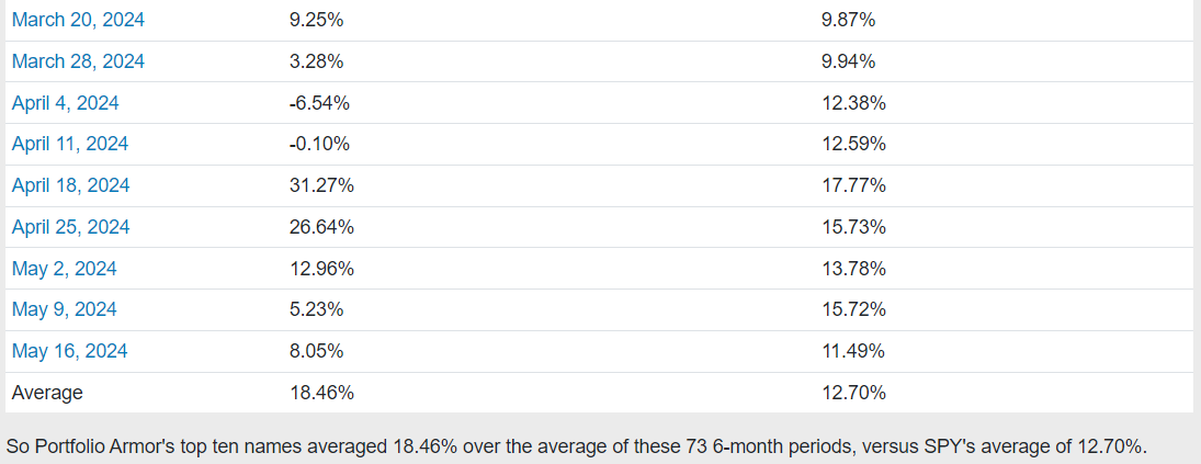 Before we get to this week’s top ten names, let’s look at the final, 6-month performance of our top ten names from May 16th, 2024.