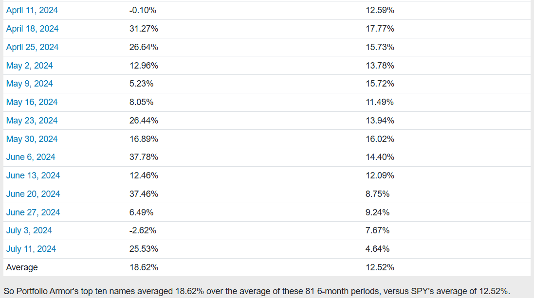 Before we get to this week’s top ten names, let’s look at the final, 6-month performance of our top ten names from July 11th, 2024.