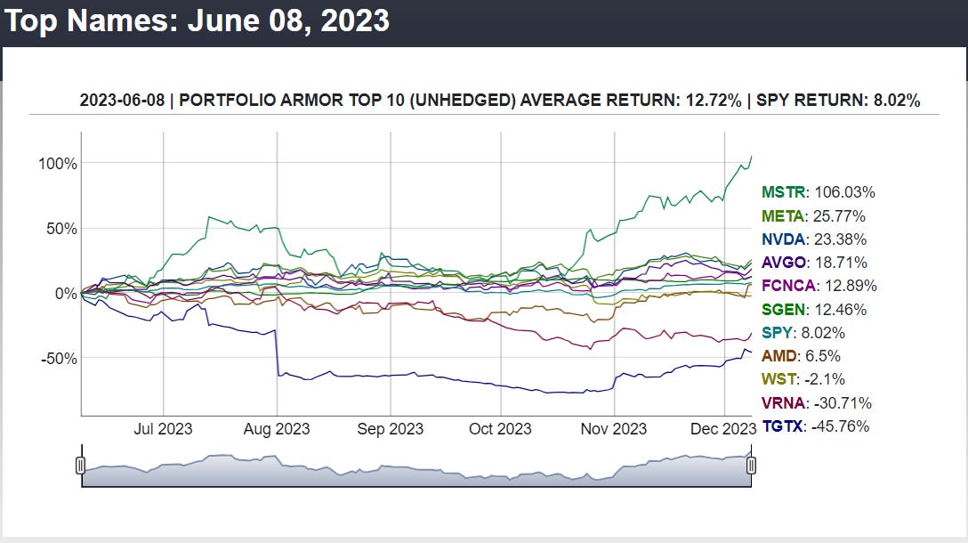 Our core strategy is to buy equal dollar amounts of the Portfolio Armor web app’s top ten names, put trailing stops of 10%-15% on them, and replace them with names from the current week’s top ten when we get stopped out of a position.