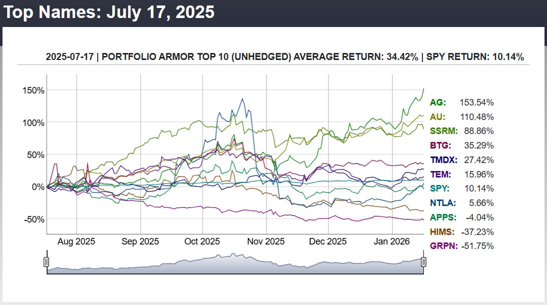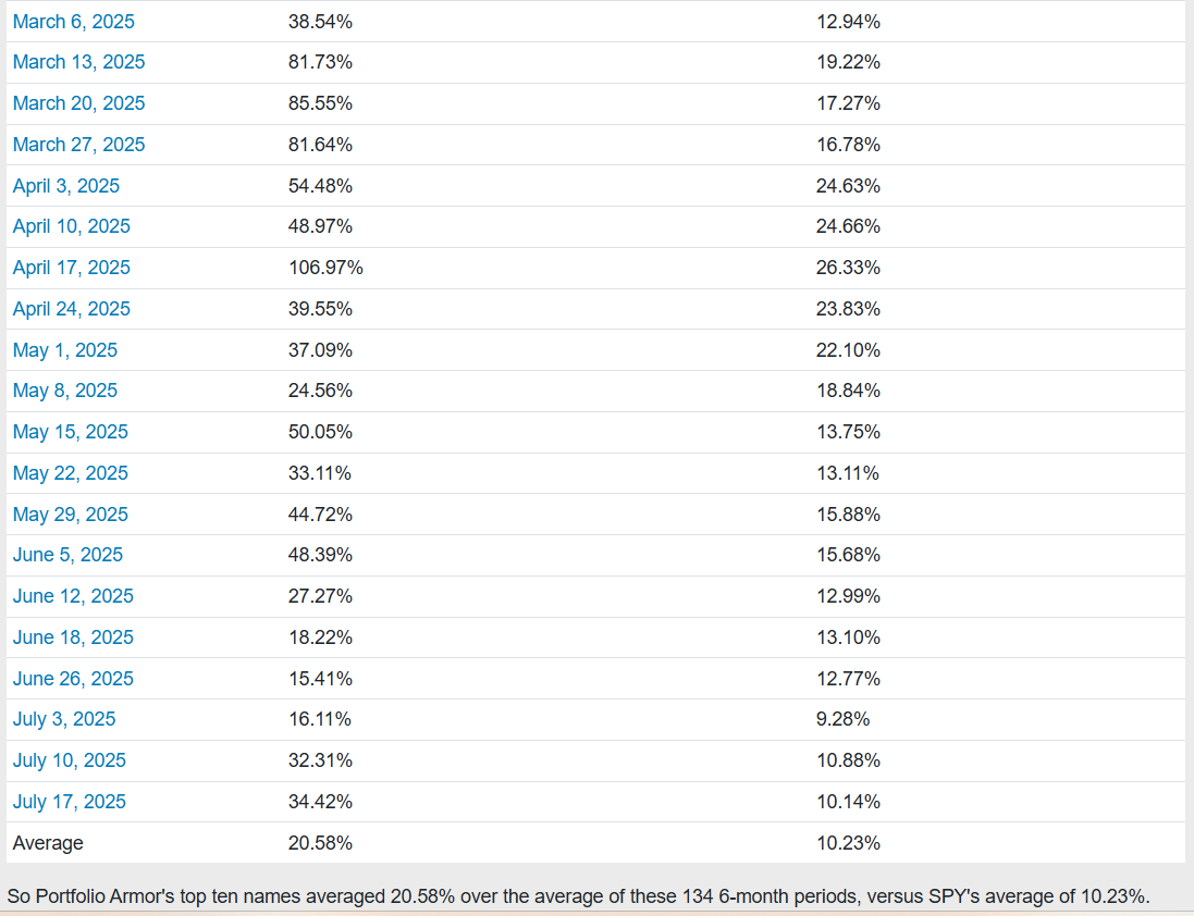 Before we get to this week’s top ten names, let’s look at the final, 6-month performance of our top ten names from 7/17/2025.