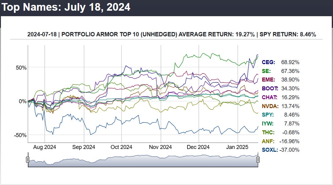 Before we get to this week’s top ten names, let’s look at the final, 6-month performance of our top ten names from July 18th, 2024.