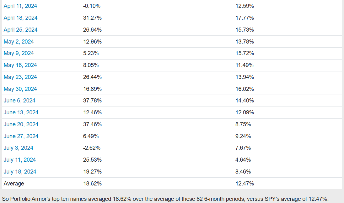 Our top names from July 18th were up 19.27%, on average, over the next six months, versus up 8.46% for the SPDR S&P 500 Trust (SPY 0.00%↑).