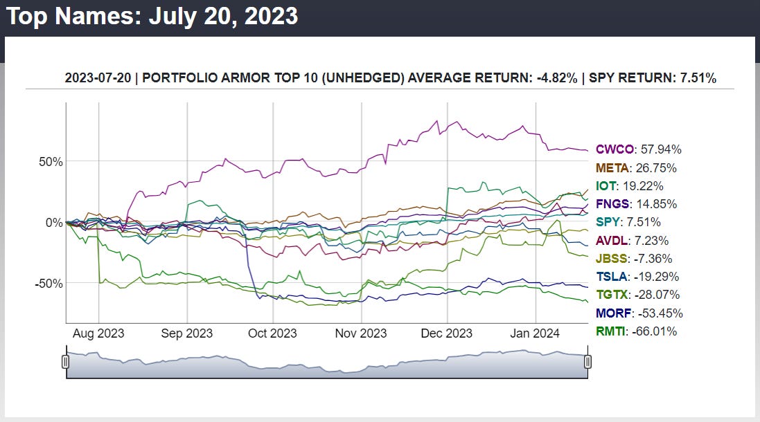 Our core strategy is to buy equal dollar amounts of the Portfolio Armor web app’s top ten names, put trailing stops of 10%-15% on them, and replace them with names from the current week’s top ten when we get stopped out of a position.
