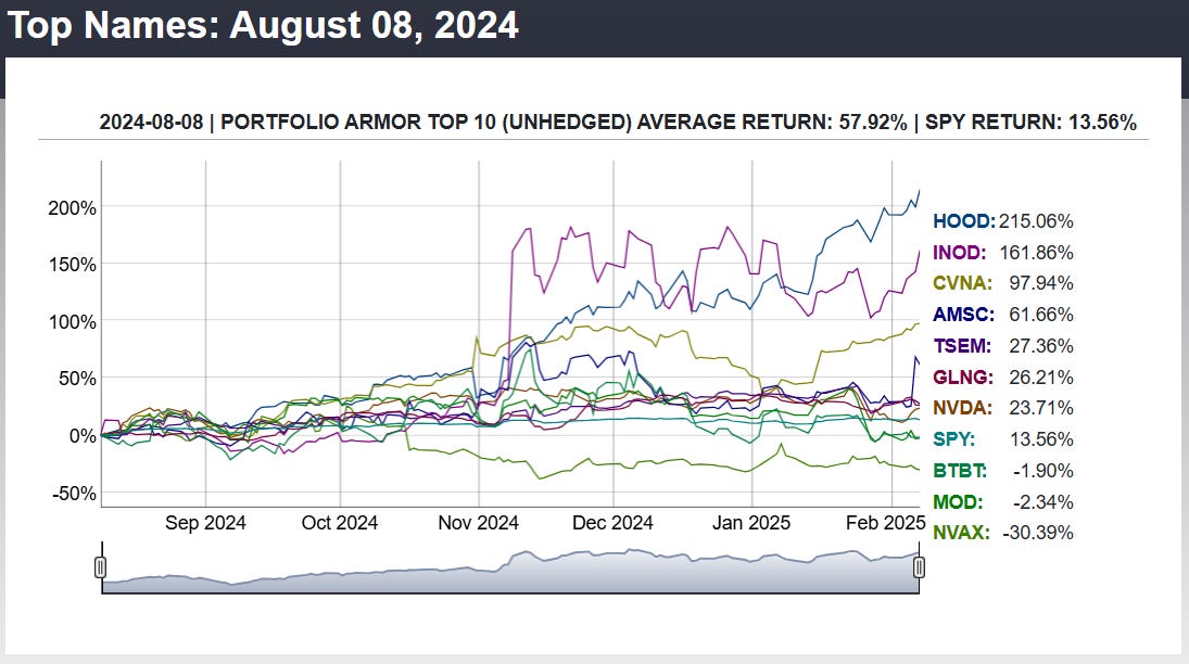 Before we get to this week’s top ten names, let’s look at the final, 6-month performance of our top ten names from August 8th, 2024.